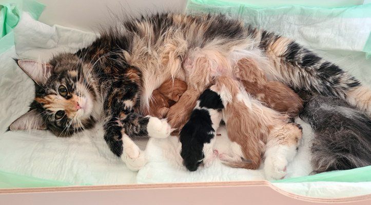 Tilly hat die Geburt souverän und sehr schnell gemeistert. Sie ist eine äußerst fürsorgliche Mutter und die Kleinen sind bestens versorgt. Somit ist es meist ruhig in der Wurfbox, außer es verliert mal einer den Anschluss oder kriegt nicht die Zitze, die er will. Dann sind die kleinen Stimmchen allerdings sehr nachdrücklich.